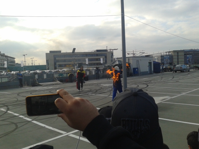 Zu erst war er gegen 14:00 Uhr auf dem Parkdeck. Dort waren die Vorbereitungen für die Stuntshow von stuntteam.net im vollen Gange. Sie boten Auto-/ Motorrad- und Feuerstunts. Dabei war auch Torsten Sarazzin.
