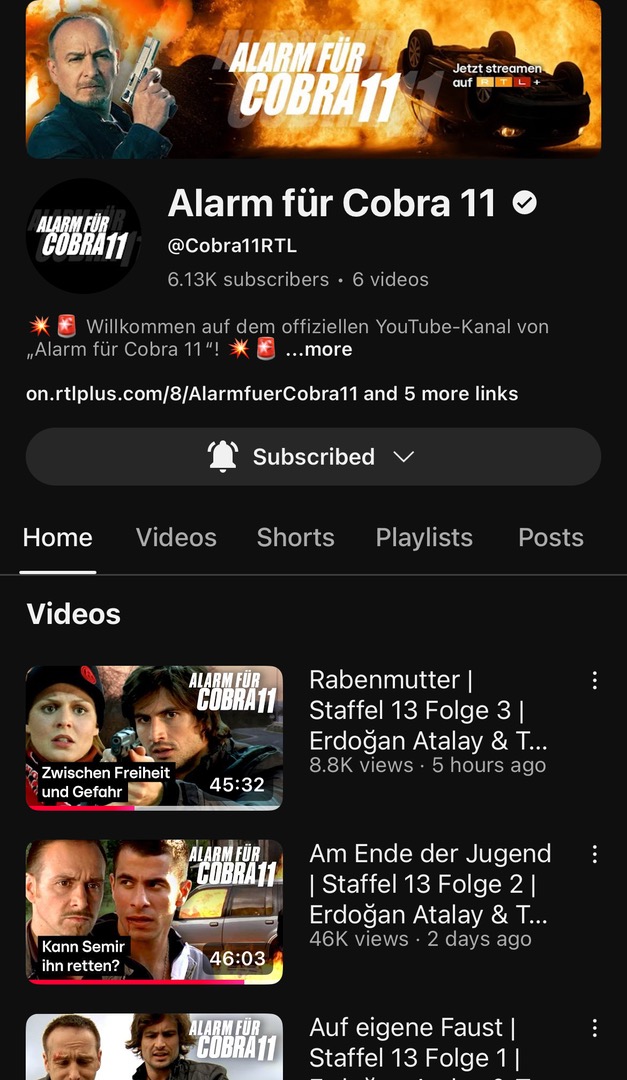 Interessant, das erklärt vielleicht auch das plötzliche verschwinden des "Cobra 11 Freunde" Youtube Kanals vor einigen Wochen, welcher diverse Cobra 11 Inhalte lange Zeit online hatte und nicht seitens RTL betrieben wurde. Auch interssant ist, dass man bei den Thumbnails auf eins der korrekten ehemaligen Cobra 11 Logos zurückgreift und beim Kanaldesign scheinbar das falsche Wikipedia Logo (abgerundetes "C" entspricht nicht dem offiziellen Logo) verwendet.