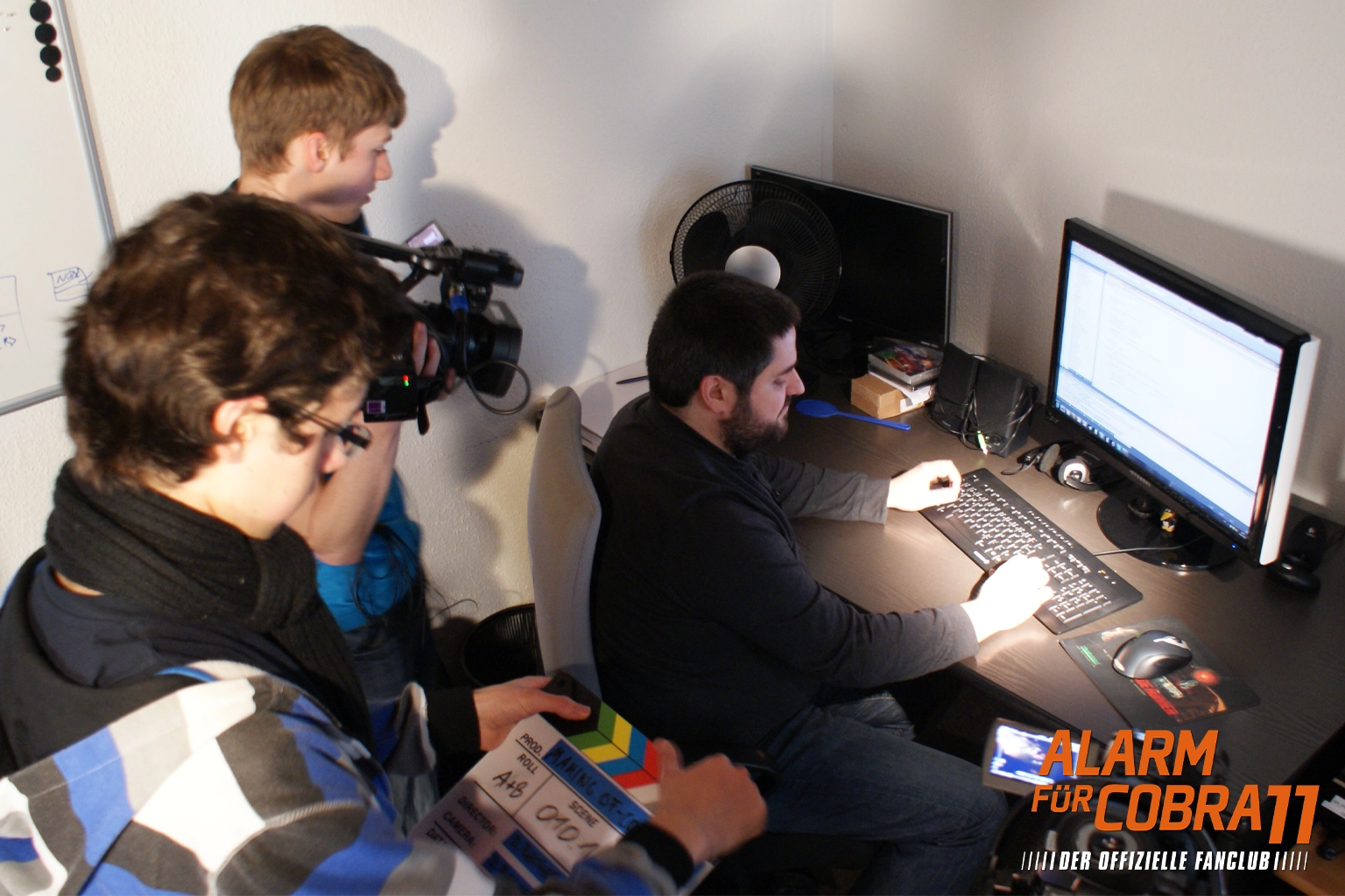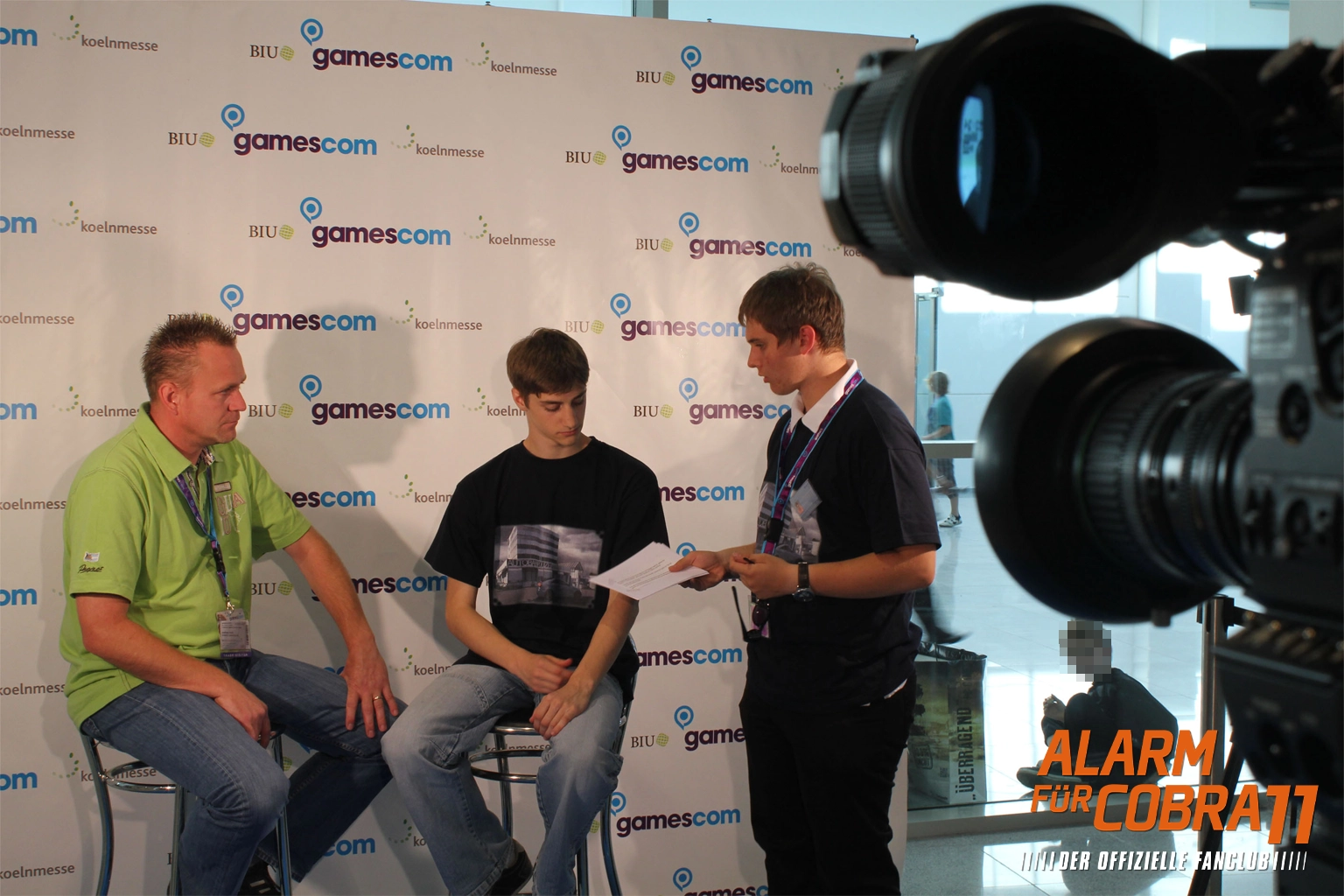 Unmittelbar nach meinem Einzug stand die gamescom 2011 vor der Tür und im Rahmen unserer Fanpage „Cobra 11 Games“ organisierte ich ein kleines Communitytreffen am Stand von „dtp entertainment“, dem Publisher des zu diesem Zeitpunkt aktuellen „Alarm für Cobra 11“ – Videospiels. So konnten sich die Fans der Spielereihe vor Ort einen Einblick in das neue Spiel verschaffen und in direkten Kontakt mit Publisher und Entwicklerstudio treten. An diesem Tag lernte ich auch selbst, nach vielen langen E-Mails, Andreas Leicht von Synetic und Nils Goette von dtp kennen. Natürlich nutzte ich auch dieses Event wieder, um etwas von der Veranstaltung vor Ort auf die Bildschirme nach Hause zu bringen und so entstand eins meiner ersten Interviews vor laufender Kamera.